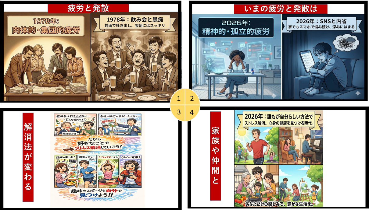 ナレーション: 疲れは主に「肉体的・集団的」で、わかりやすいものでした。